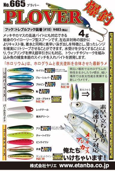 | メッキやカマスの高速バイトにも対応できる細身のウイローリーフ型スプーンです。 左右非対称の設計によりキャスト後、着水と同時に素早い泳ぎ出しを特徴とし、 狙ったレンジを確実にリトリーブさせることができます。 水受けを少なくすることにより、ウォブリングを抑え超早引きにも対応、 ツイッチやジャークを組み込み、魚の捕食本能のスイッチを入れバイトを誘発します。 対象魚:メッキ・カマス・アジ・セイゴ・サバ・メバルなど 開発協力:イエローソルトウォータークラブ |