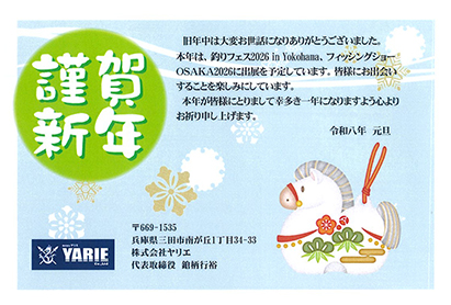 ![]() 1月5日までは、年末年始の休業となります。 しっかり英気を養って、気力を充実させフィッシングショーの準備にとりかかりたいと思います。 ヤリエは創業100年を迎えました。 これからも精進し頑張っていきたいと思います。 2026年も応援よろしくお願いいたします。 |