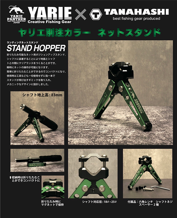 | 1月のプレゼントは、ヤリエXタナハシコラボ スタンドホッパーです。 折りたたみ可能なネット用ポジションアップスタンド。 シャフトに装着することにより地面とシャフトの間にクリアランスを作ることができ、 瞬時にネットの操作が可能になります。 簡単に折りたたむことができるのでコンパクトになり、 使用時は工具なども一切使用せずに指一本でスタンドが飛び出すギミックを取り入れ メカニックなデザインに設計しました。 |